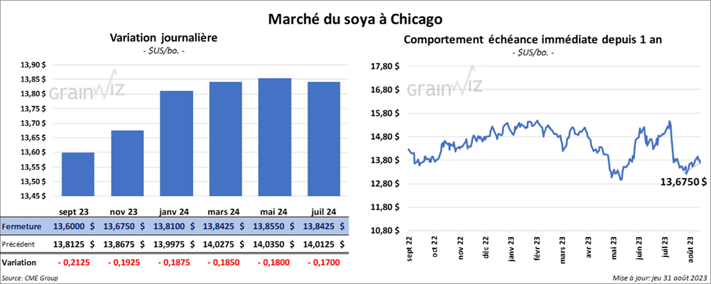 Le contrat de soya US sept, 23 a clôturé à 13,6000 $ (- 21 ¼ cents). Celui nov. 23 a fermé à 13,6750 $ (- 19 ¼ cents). Celui janv. 24 a terminé à 13,8100 $ (- 18 ¾ cents). Quant au tourteau de soya US, le contrat sept. 23 a fini à 418,70 $/tonne (- 4,30 $/tonne). Celui oct. 23 a clôturé à 404,70 $/tonne (- 6,30 $/tonne). Celui déc. 23 a fermé à 404,00 $/tonne (- 6,20 $/tonne). Du côté de l’huile de soya US, le contrat sept. 23 a terminé à 4,6100 $ (- 75 points). Celui déc. 23 a fini à 4,7825 $ (- 250 points).
