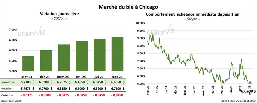 À Chicago, le contrat de blé sept. 23 a clôturé à 5,7300 $ (- 3 ¾ cents). Celui déc. 23 a fermé à 6,0200 $ (- 5 cents). Celui mars 24 a terminé à 6,2875 $ (- 4 ¾ cents). À Kansas, le contrat de blé dur rouge d’hiver a fini à 7,2640 $ (+ 7 ¼ cents). Celui déc. 23 a clôturé à 7,2720 $ (- 4 ½ cents). Celui mars 24 a fermé à 7,5360 $ (- 4 ¾ cents). À Minneapolis, le contrat de blé de printemps sept. a terminé à 7,3500 $ (- 13 ¾ cents). Celui déc. 23 a fini à 7,6750 $ (- 12 cents). Celui mars 24 a clôturé à 7,8475 $ (- 12 ¾ cents).