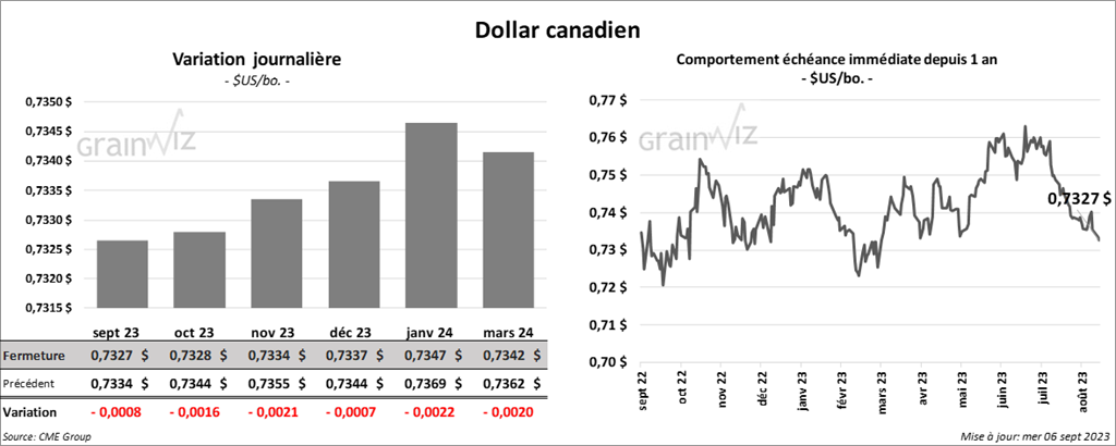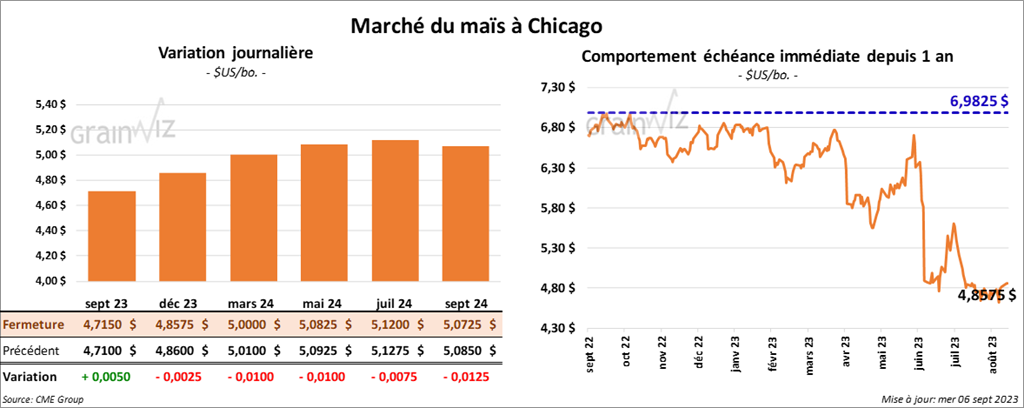 Le contrat de maïs US sept. 23 a clôturé à 4,7150 $ (+ ½ cent). Celui déc. 23 a fermé à 4,8575 $ (- ¼ cent). Celui mars 24 a terminé à 5,0000 $ (- 1 cent).