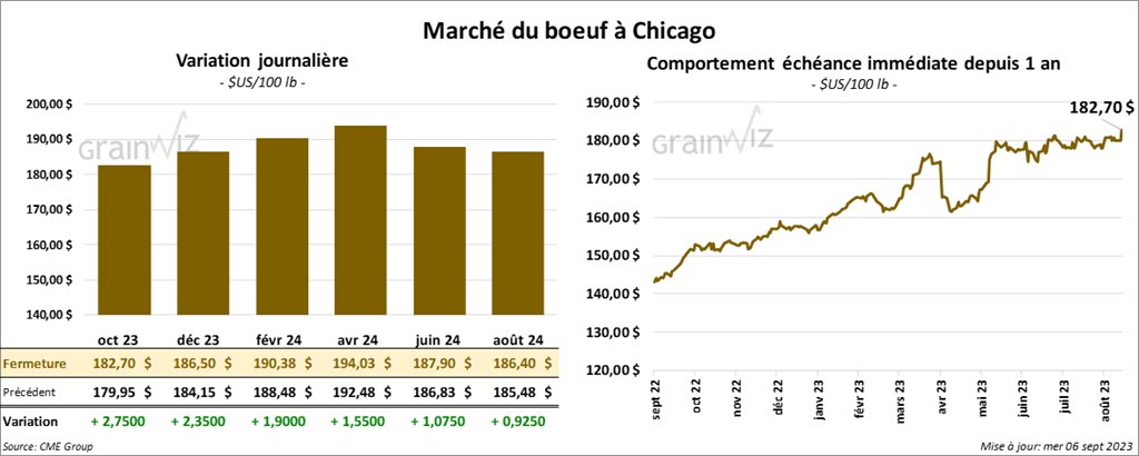 Le contrat de bœuf US oct. 23 a clôturé à 182,70 $ (+ 2,75 $). Celui déc. 23 a fermé à 186,50 $ (+ 2,35 $). Celui févr. 24 a terminé à 190,38 $ (+ 1,90 $). Quant au veau US, le contrat sept. 23 a fini à 253,15 $ (+ 1,77 $). Celui oct. 23 a clôturé à 256,48 $ (+ 2,17 $). Celui nov. 23 a fermé à 258,20 $ (+ 2,00 $).