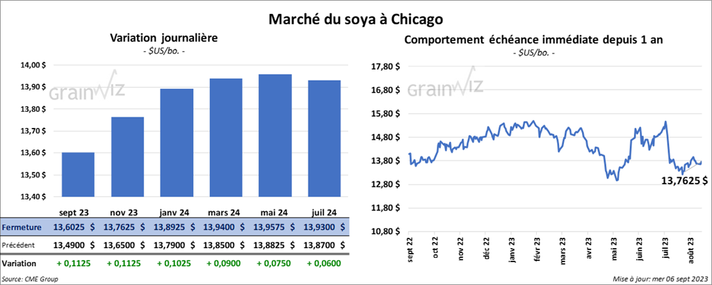Le contrat de soya US sept. 23 a clôturé à 13,6025 $ (+ 11 ¼ cents). Celui nov. 23 a fermé à 13,7625 $ (+ 11 ¼ cents). Celui janv. 24 a terminé à 13,8925 $ (+ 10 ¼ cents). Quant au tourteau de soya US, le contrat sept. 23 a fini à 408,10 $/tonne (+1,80 $/tonne). Celui oct. 23 a clôturé à 400,90 $/tonne (+ 1,60 $/tonne). Celui déc. 23 a fermé à 399,20 $/tonne (+ 1,60 $/tonne). Du côté de l’huile de soya US, le contrat sept. 23 a terminé à 65,35 $ (- 65 points). Celui oct. 23 a fini à 63,78 $ (- 48 points).