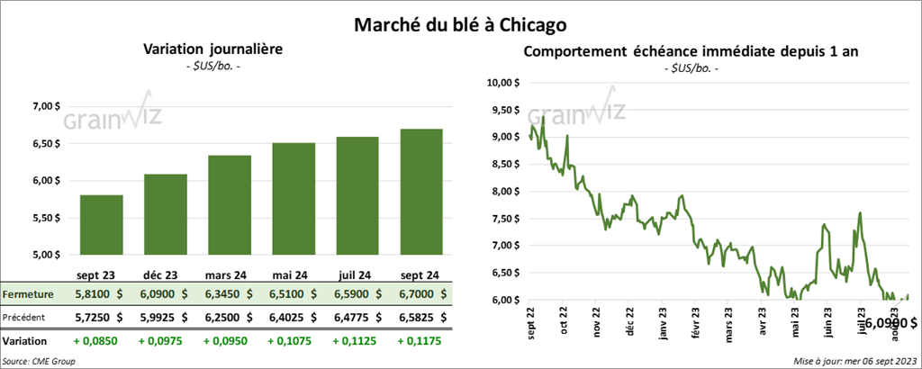 À Chicago, le contrat de blé sept. 23 a clôturé à 5,8100 $ (+ 8 ½ cents). Celui déc. 23 a fermé à 6,0900 $ (+ 9 ¾ cents). Celui mars 24 a terminé à 6,3450 $ (+ 9 ½ cents). À Kansas, le contrat de blé dur rouge sept. 23 a fini à 7,4640 $ (+ 25 ¼ cents). Celui déc. 23 a clôturé à 7,4940 $ (+ 25 cents). Celui mars 24 a fermé à 7,5200 $ (+ 23 ¼ cents). À Minneapolis, le contrat de blé de printemps sept. 23 a terminé à 7,5625 $ (+ 21 cents). Celui déc. 23 a fini à 7,8250 $ (+ 20 ¼ cents). Celui mars 24 a clôturé à 8,0050 $ (+ 20 ½ cents).