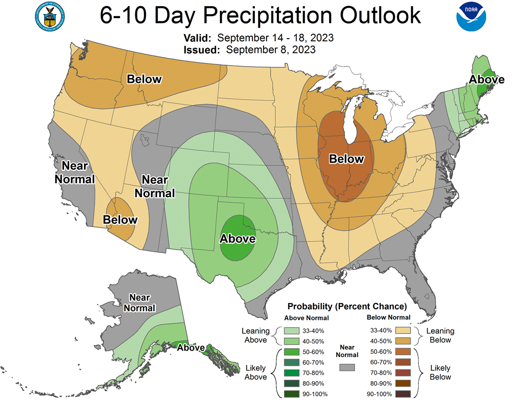 - De son côté, le NOAA anticipe des averses légères pour le Midwest au cours de la semaine prochaine. Il anticipe aussi des précipitations bénéfiques pour le sud des Plaines US au cours du week-end.