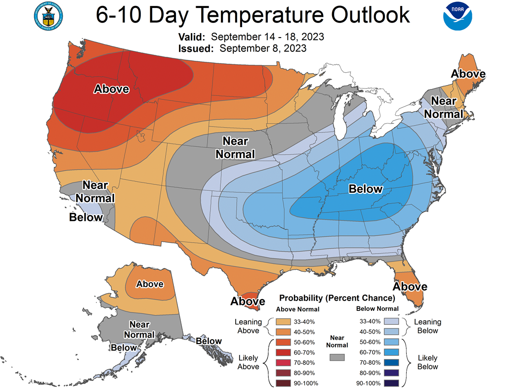- Cette autre carte US, toujours fournie par le NOAA et dessinée pour les 6 à 10 prochains jours, montre notamment des températures plus fraiches que la normale dans une bonne partie du Midwest et du centre des Plaines US (voir les zones bleues).