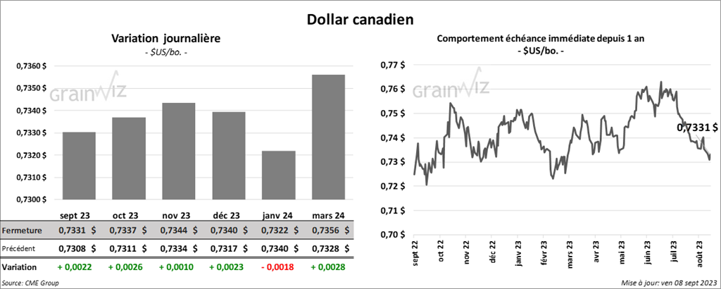 À Chicago, le contrat de blé sept. 23 a clôturé à 5,6725 $ (- 4 ¼ cents). Celui déc. 23 a fermé à 5,9575 $ (- 4 cents). Celui mars 24 a terminé à 6,2175 $ (- 4 cents). À Kansas, le contrat de blé dur rouge sept. 23 a fini à 7,2500 $ (- 8 ¾ cents). Celui déc. 23 a clôturé à 7,3200 $ (- 5 cents). Celui mars 24 a fermé à 7,3540 $ (- 5 ½ cents). À Minneapolis, le contrat de blé de printemps sept. 23 a terminé à 7,4350 $ (- 4 ¼ cents). Celui déc. 23 a fini à 7,7075 (- 4 cents). Celui mars 24 a clôturé à 7,8775 $ (- 4 ¼ cents).