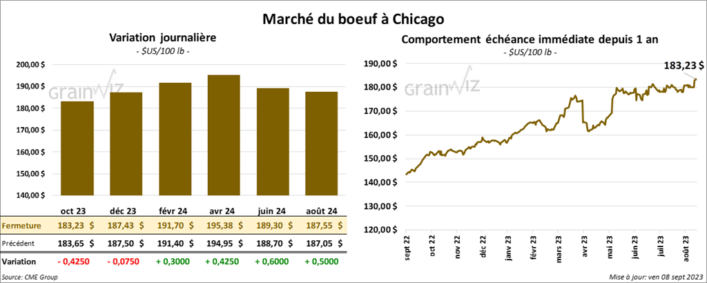 Le contrat de bœuf US oct. 23 a clôturé à 183,23 $ (- 43 cents). Celui déc. 23 a fermé à 187,43 $ (- 8 cents). Celui févr. 24 a terminé à 191,70 $ (+ 30 cents). Quant au veau US, le contrat sept. 23 a fini à 255,35 $ (- 23 cents). Celui oct. 23 a clôturé à 259,15 $ (+ 28 cents). Celui nov. 23 a fermé à 260,63 $ (+ 35 cents).