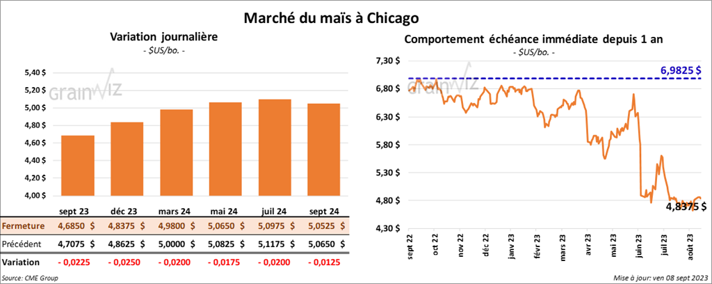 Le contrat de maïs US sept. 23 a clôturé à 4,6850 $ (- 2 ¼ cents). Celui déc. 23 a fermé à 4,8375 $ (- 2 ½ cents). Celui mars 24 a terminé à 4,9800 $ (- 2 cents).