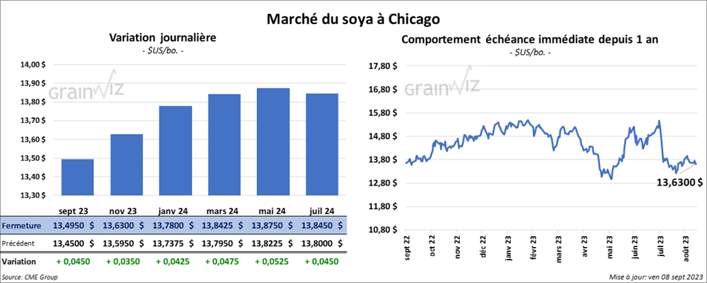 Le contrat de soya US sept. 23 a clôturé à 13,4950 $ (+ 4 ½ cents). Celui nov. 23 a fermé à 13,6300 $ (+ 3 ½ cents). Celui janv. 24 a terminé à 13,7800 $ (+ 4 ¼ cents). Quant au tourteau de soya US, le contrat sept. 23 a fini à 411,90 $/tonne (+ 8,50 $/tonne). Celui oct. 23 a clôturé à 402,70 $/tonne (+ 6,30 $/tonne). Celui déc. 23 a fermé à 401,40 $/tonne (+ 6,10 $/tonne). Du côté de l’huile de soya US, le contrat sept. 23 a terminé à 63,15 $ (- 71 points). Celui oct. 61,46 $ (- 63 points).