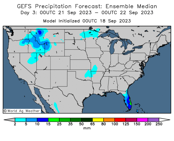 - Selon World Ag Weather, au cours de la semaine, des averses pourraient avoir lieu dans l’ouest du Midwest (Corn Belt) et certaines parties du nord des Plaines US. Toutefois, si ces précipitations pourraient affecter la maturation des cultures et la progression des récoltes, l’organisme croit que les retards qui en découleront seront probablement mineurs.