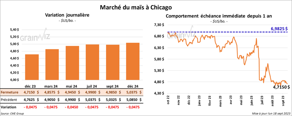 Le contrat de maïs US déc. 23 a clôturé à 4,7150 $ (- 4 ¾ cents). Celui mars 24 a fermé à 4,8575 $ (- 4 ¾ cents). Celui mai 24 a terminé à 4,9450 $ (- 4 ½ cents).