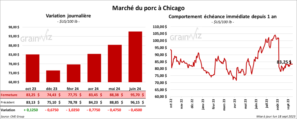 Le contrat de porc US oct. 23 a clôturé à 83,25 $ (+ 13 cents). Celui déc. 23 a fermé à 74,43 $ (- 68 cents). Celui févr. 24 a terminé à 77,75 $ (- 1,03 $).