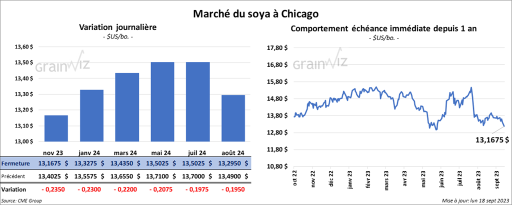 Le contrat de soya US nov. 23 a clôturé à 13,1675 $ (- 23 ½ cents). Celui janv. 24 a fermé à 13,3275 $ (- 23 cents). Celui mars 24 a terminé à 13,4350 $ (- 22 cents). Quant au tourteau de soya US, le contrat oct. 23 a fini à 380,20 $/tonne (- 3,40 $/tonne). Celui déc. 23 a clôturé à 387,80 $/tonne (- 4,30 $/tonne). Celui janv. 24 a fermé à 384,50 $/tonne (- 4,60 $/tonne). Du côté de l’huile de soya US, le contrat oct. 23 a terminé à 62,39 $ (- 99 points). Celui déc. 23 a fini à 60,94 $ (- 112 points).