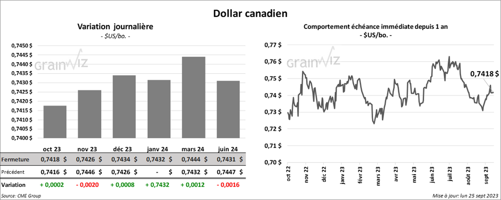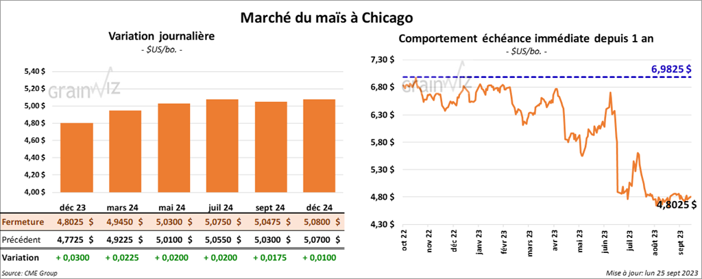 Le contrat de maïs US déc. 23 a clôturé à 4,8025 $ (+ 3 cents). Celui mars 24 a fermé à 4,9450 $ (+ 2 ¼ cents). Celui mai 24 a terminé à 5,0300 $ (+ 2 cents).