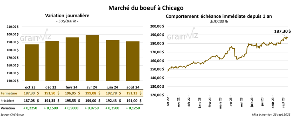 Le contrat de bœuf US oct. 23 a clôturé à 187,30 $ (+ 23 cents). Celui déc. 23 a fermé à 191,50 $ (+ 15 cents). Celui févr. 23 a terminé à 196,05 $ (+ 50 cents). Dans le cas du veau US, le contrat sept. 23 a fini à 253,88 $ (- 23 cents). Celui oct. 23 a clôturé à 258,82 $ (- 33 cents). Celui nov. 23 a fermé à 262,70 $ (- 82 cents).