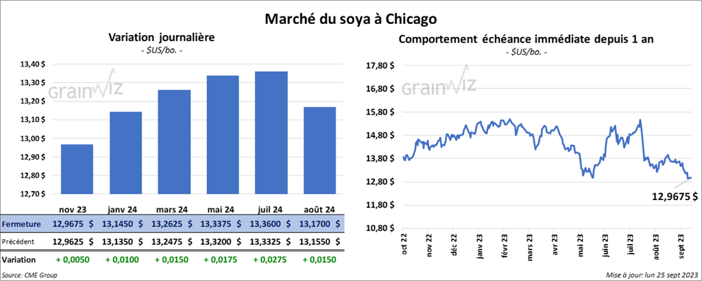 Le contrat de soya US nov. 23 a clôturé à 12,9675 $ (+ ½ cent). Celui janv. 24 a fermé à 13,1450 $ (+ 1 cent). Celui mars 24 a terminé à 13,2625 $ (+ 1 ½ cent). Quant au tourteau de soya US, le contrat oct. 23 a fini à 392,10 $/tonne (+ 3,90 $/tonne). Celui déc. 23 a clôturé à 389,90 $/tonne (+ 4,10 $/tonne). Celui janv. 24 a fermé à 385,90 $ (+ 3,60 $/tonne). Dans le cas de l’huile de soya US, le contrat oct. 23 a terminé à 58,75 $ (- 210 points). Celui déc. 23 a fini à 57,48 $ (- 214 points).