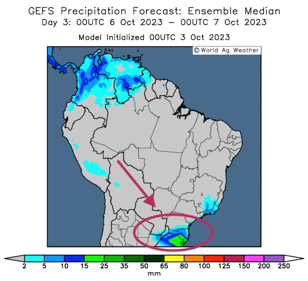 - Cette carte du Brésil, fournie par World Ag Weather et dessinée pour les 3 prochains jours, indique des averses abondantes probables pour l’extrême sud du pays (voir notamment la zone encerclée).
