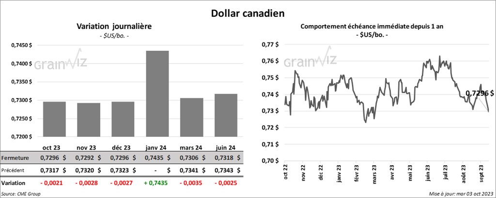 Le contrat de soya US nov. 23 a clôturé à 12,7275 $ (- 4 ¼ cents). Celui janv. 24 a fermé à 12,9200 $ (- 4 ¾ cents). Celui mars 24 a terminé à 13,0750 $ (- 5 ¾ cents). Quant au tourteau de soya US, le contrat oct. 23 a fini à 363,20 $/tonne (- 4,40 $/tonne). Celui déc. 23 a clôturé à 371,70 $/tonne (- 2,60 $/tonne). Celui janv. 24 a fermé à 371,10 $/tonne (- 1,70 $/tonne). Du côté de l’huile de soya US, le contrat oct. 23 a terminé à 59,45 $ (- 40 points). Celui déc. 23 a fini à 57,13 $ (- 30 points).