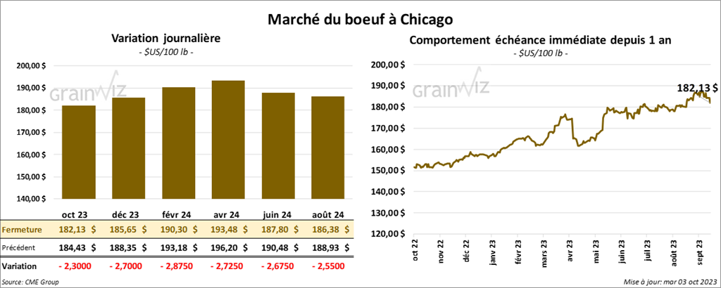 Le contrat de bœuf US oct. 23 a clôturé à 182,13 $ (- 2,30 $). Celui déc. 23 a fermé à 185,65 $ (- 2,70 $). Celui févr. 24 a terminé à 190,30 $ (- 2,88 $). Dans le cas du veau US, le contrat oct. 23 a fini à 248,50 $ (- 4,72 $). Celui nov. 23 a clôturé à 250,35 $ (- 5,35 $). Celui janv. 24 a fermé à 254,28 $ (- 5,08 $).