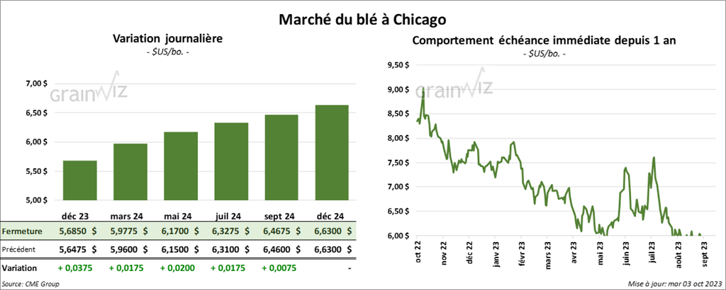 À Chicago, le contrat de blé déc. 23 a clôturé à 5,6850 $ (+ 3 ¾ cents). Celui mars 24 a fermé à 5,9775 $ (+ 1 ¾ cent). Celui mai 24 a terminé à 6,1700 $ (+ 2 cents). À Kansas, le contrat de blé dur rouge déc. 23 a fini à 6,8320 $ (+ 6 ½ cents). Celui mars 24 a clôturé à 6,9040 $ (+ 6 cents). Celui mai 24 a fermé à 6,9620 $ (+ 5 ¼ cents). À Minneapolis, le contrat de blé de printemps déc. 23 a terminé à 7,2550 $ (+ 6 ¾ cents). Celui mars 24 a fini à 7,4800 $ (+ 6 ½ cents). Celui mai 24 a clôturé à 7,6275 $ (+ 5 cents).
