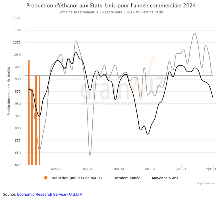 Durant la semaine du 29 septembre dernier, la production moyenne d’éthanol US a été de 1,009 million de barils par jour, ce qui était inchangé par rapport à la semaine précédente, mais aussi une augmentation de 13,5 % comparativement à l’an dernier. 7,063 millions de barils d’éthanol US ont été produits au cours de la semaine. 100,15 millions de boisseaux de maïs ont été utilisés dans la fabrication de l’éthanol US.