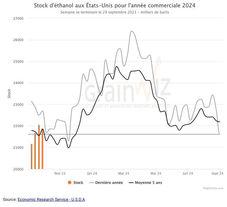 Quant aux stocks d’éthanol US, ils ont été en baisse de 0,7 % comparativement à la semaine précédente et en hausse de 0,9 % par rapport à l’an passé à 21,884 millions de barils.