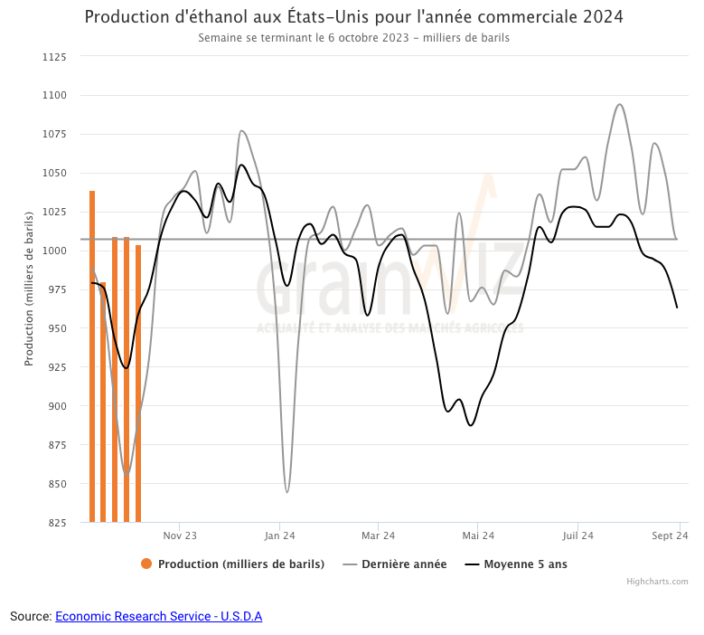 Durant la semaine du 6 octobre dernier, la production moyenne d’éthanol US a été de 1,004 million de barils par jour, ce qui était une baisse de 0,5 % comparativement à la semaine précédente et une hausse de 7,7 % par rapport à la même période l’an dernier. Un total de 7,028 millions de barils d’éthanol US a été produit au cours de la semaine. 99,65 millions de boisseaux de maïs ont été utilisés dans la fabrication de l’éthanol US.
