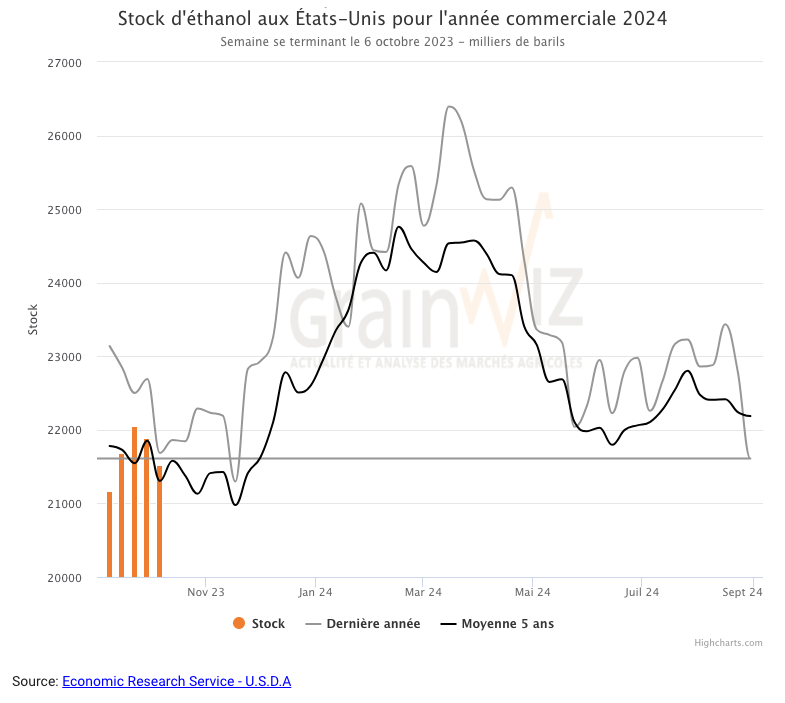 Quant aux stocks d’éthanol US, ils ont été établis à 21,526 millions de barils, soit à une baisse de 1,6 % comparativement à la semaine précédente et à une réduction de 1,5 % par rapport à l’an passé.