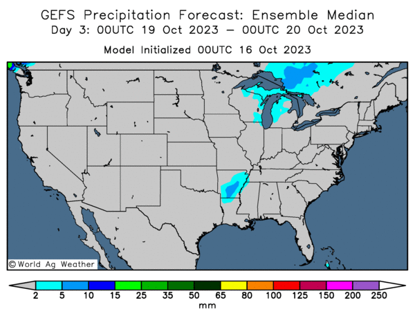 - Pour une bonne partie du Midwest, World Weather prévoit deux épisodes de pluie au cours des deux prochaines semaines. Par conséquent, au cours de cette période, les travaux de récolte pourraient se poursuivre à un bon rythme.