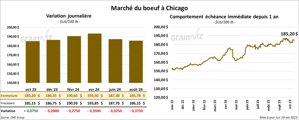 Le contrat de bœuf US oct. 23 a clôturé à 185,20 $ (+ 76 cents). Celui déc. 23 a fermé à 186,55 $ (- 20 cents). Celui févr. 24 a terminé à 190,65 $ (- 28 cents). Quant au veau US, le contrat oct. 23 a fini à 248,32 $ (- 1,55 $). Celui nov. 23 a clôturé à 249,93 $ (- 1,65 $). Celui janv. 24 a fermé à 251,53 $ (- 72 cents).