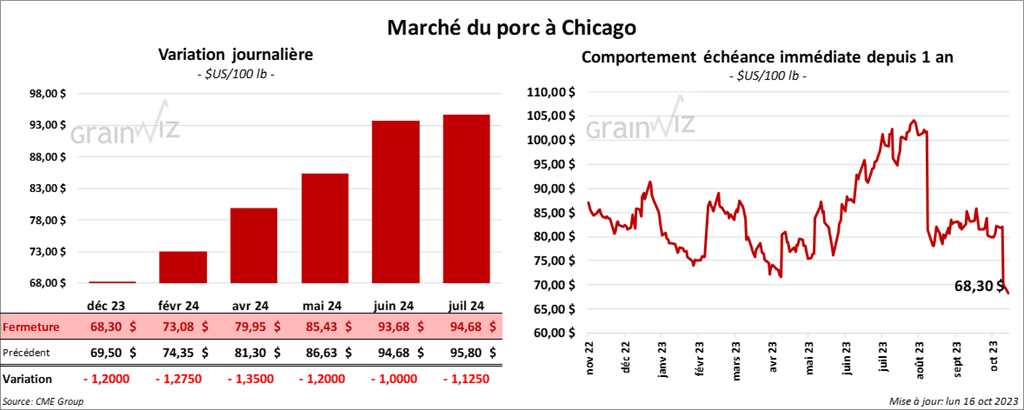 Le contrat de porc US déc. 23 a clôturé à 68,30 $ (- 1,20 $). Celui févr. 24 a fermé à 73,08 $ (- 1,28 $). Celui avr. 24 a terminé à 79,95 $ (- 1,35 $).