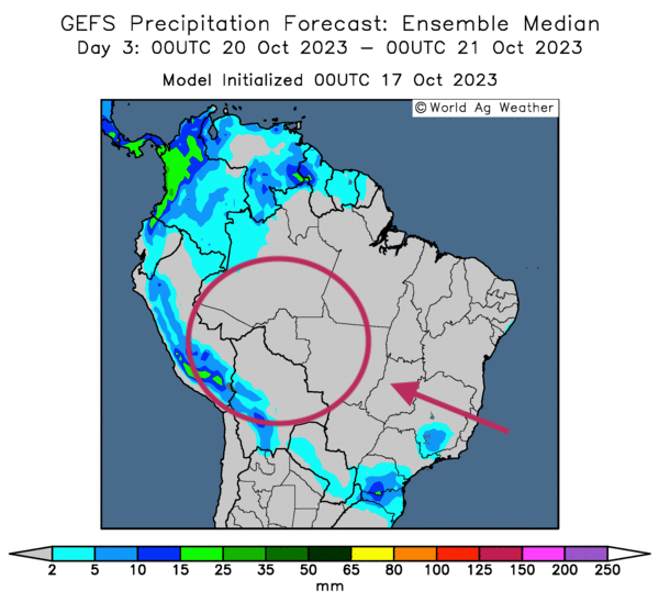 - Cette carte du Brésil, fournie par World Ag Weather et dessinée pour les 3 prochains jours, montre que les conditions dans le centre-ouest pourraient demeurer plus sèches qu’autrement.