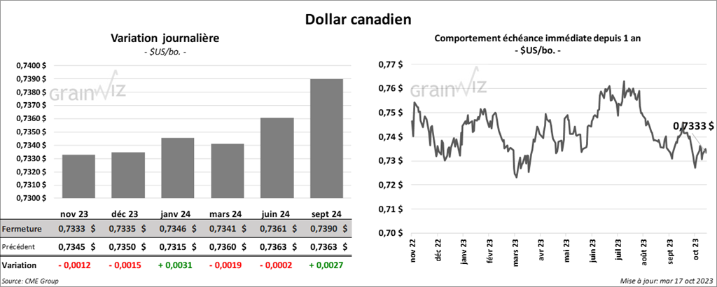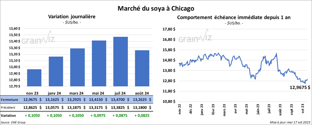 Le contrat de soya US nov. 23 a clôturé à 12,9675 $ (+ 10 ½ cents). Celui janv. 24 a fermé à 13,1625 $ (+ 10 ½ cents). Celui mars 24 a terminé à 13,2925 $ (+ 10 ½ cents). Quant au tourteau de soya US, le contrat déc. 23 a fini à 399,80 $/tonne (+ 9,60 $/tonne). Celui janv. 24 a clôturé à 394,70 $/tonne (+ 8,80 $/tonne). Celui mars 24 a fermé à 389,00 $/tonne (+ 7,90 $/tonne). Du côté de l’huile de soya US, le contrat déc. 23 a terminé à 55,35 $ (- 55 points). Celui janv. 24 a fini à 54,63 $ (- 49 points).