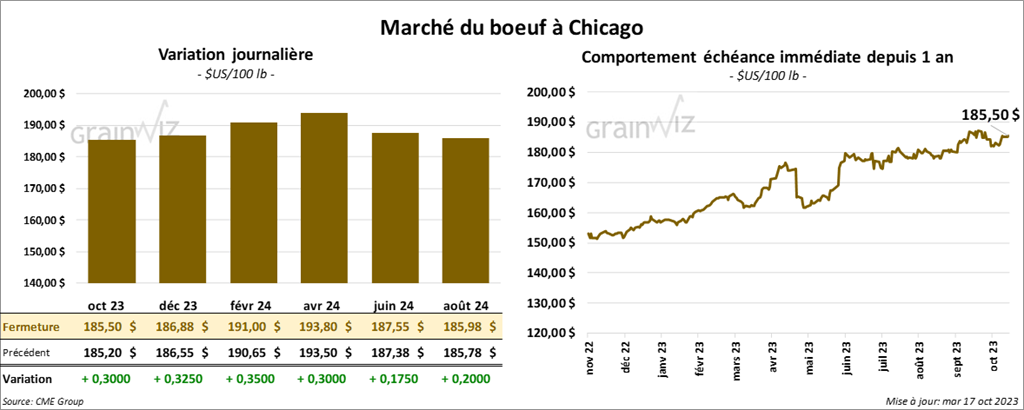 Le contrat de bœuf US oct. 23 a clôturé à 185,50 $ (+ 30 cents). Celui déc. 23 a fermé à 186,88 $ (+ 33 cents). Celui févr. 24 a terminé à 191,00 $ (+ 35 cents). Quant au veau US, le contrat oct. 23 a fini à 248,80 $ (+ 47 cents). Celui nov. 23 a clôturé à 250,45 $ (+ 53 cents). Celui janv. 24 a fermé à 252,80 $ (+ 1,27 $).