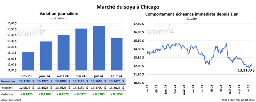 Le contrat de soya US nov. 23 a clôturé à 13,1100 $ (+ 14 ¼ cents). Celui janv. 24 a fermé à 13,2925 $ (+ 13 cents). Celui mars 24 a terminé à 13,4000 $ (+ 10 ¾ cents). Quant au tourteau de soya US, le contrat déc. 23 a fini à 413,80 $/tonne (+ 14,00 $/tonne). Celui janv. 24 a clôturé à 406,30 $/tonne (+ 11,60 $/tonne). Celui mars 24 a fermé à 398,80 $/tonne (+ 9,80 $/tonne). Dans le cas de l’huile de soya US, le contrat déc. 23 a terminé à 54,86 $ (- 49 points). Celui janv. 24 a fini à 54,08 $ (- 55 points).