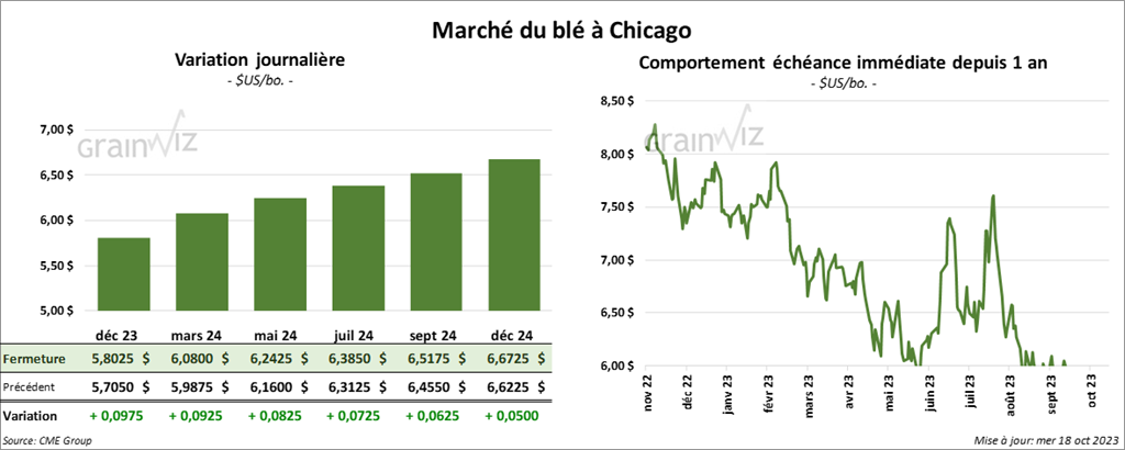 À Chicago, le contrat de blé déc. 23 a clôturé à 5,8025 $ (+ 9 ¾ cents). Celui mars 24 a fermé à 6,0800 $ (+ 9 ¼ cents). Celui mai 24 a terminé à 6,2425 $ (+ 8 ¼ cents). À Kansas, le contrat de blé dur rouge déc. 23 a fini à 6,7040 $ (+ 4 ¾ cents). Celui mars 24 a clôturé à 6,7900 $ (+ 3 ¼ cents). Celui mai 24 a fermé à 6,8440 $ (+ 3 cents). À Minneapolis, le contrat de blé de printemps déc. 23 a terminé à 7,3350 $ (+ 5 ¾ cents). Celui mars 24 a fini à 7,5475 $ (+ 5 cents). Celui mai 24 a clôturé à 7,6675 $ (+ 4 ¼ cents).