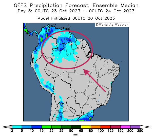 - Cette carte du Brésil, fournie par World Ag Weather et dessinée pour les 3 prochains jours, indique quelques possibilités de pluies légères pour le nord-ouest du pays (voir les zones turquoise).