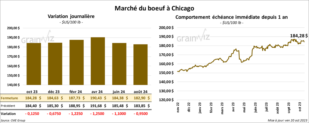 Le contrat de bœuf US oct. 23 a clôturé à 184,28 $ (- 13 cents). Celui déc. 23 a fermé à 184,63 $ (- 68 cents). Celui févr. 24 a terminé à 187,73 $ (- 1,23 $). Quant au veau US, le contrat oct. 23 a fini à 241,82 $ (- 1,75 $). Celui nov. 23 a clôturé à 242,22 $ (- 2,27 $). Celui janv. 24 a fermé à 243,05 $ (- 2,33 $).