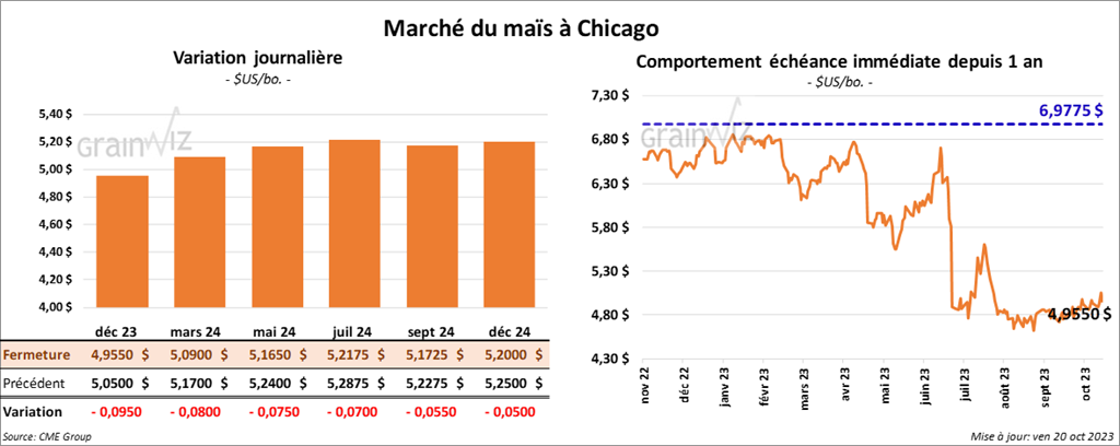 Le contrat de maïs US déc. 23 a clôturé à 4,9550 $ (- 9 ½ cents). Celui mars 24 a fermé à 5,0900 $ (- 8 cents). Celui mai 24 a terminé à 5,1650 $ (- 7 ½ cents).