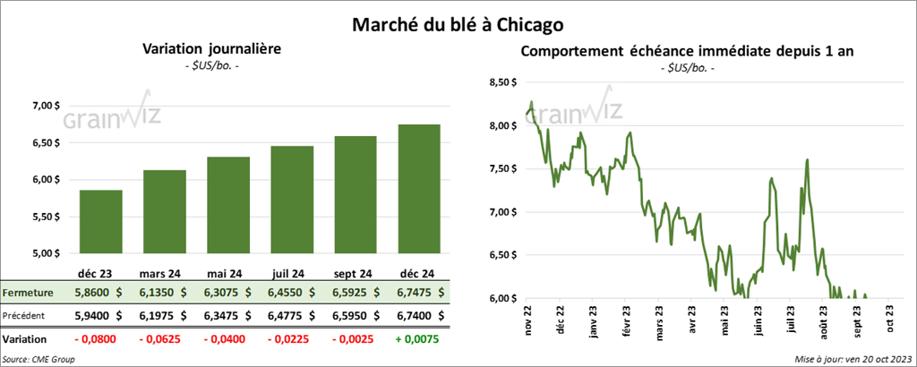 À Chicagp, le contrat déc. 23 a clôturé à 5,8600 $ (- 8 cents). Celui mars 24 a fermé à 6,1350 $ (- 6 ¼ cents). Celui mai 24 a terminé à 6,3075 $ (- 4 cents). À Kansas, le contrat de blé dur rouge déc. 23 a fini à 6,7000 $ (- 6 ¼ cents). Celui mars 24 a clôturé à 6,7000 $ (- 6 ¼ cents). Celui mai 24 a fermé à 6,8520 $ (- 4 ½ cents). À Minneapolis, le contrat déc. 23 a terminé à 7,3075 $ (- 8 ¼ cents). Celui mars 24 a fini à 7,5300 $ (- 8 ½ cents). Celui mai 24 a clôturé à 7,6550 $ (-7 ½ cents).