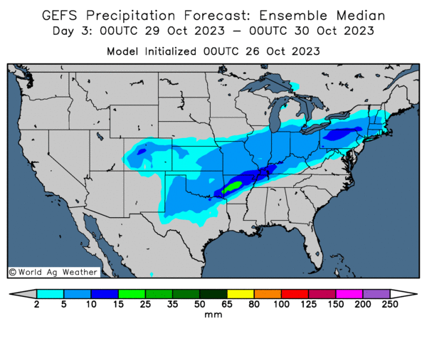 - Cette carte US, fournie par World Ag Weather et dessinée pour les 3 prochains jours, montre notamment des averses possibles dans le bas Midwest jusque dans le centre des Plaines US (voir les zones en bleu).