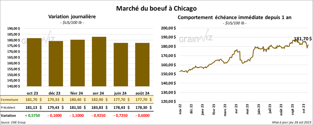 Le contrat de bœuf US oct. 23 a clôturé à 181,70 $ (+ 58 cents). Celui déc. 23 a fermé à 179,33 $ (- 10 cents). Celui févr. 24 a terminé à 180,40 $ (- 1,10 $). Quant au veau US, le contrat nov. 23 a fini à 236,50 $ (- 1,55 $). Celui janv. 24 a clôturé à 235,07 $ (- 1,48 $). Celui mars 24 a fermé à 237,75 $ (- 1,48 $).