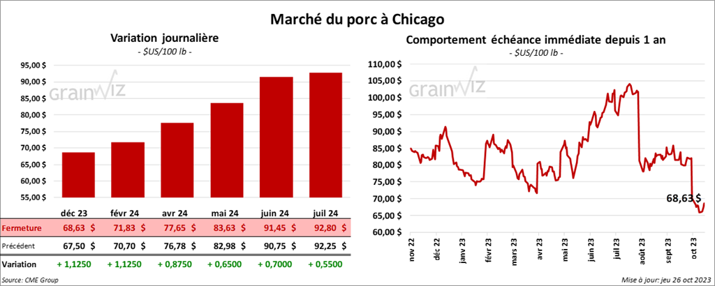 Le contrat de porc US déc. 23 a clôturé à 68,63 $ (+ 1,13 $). Celui févr. 24 a fermé à 71,83 $ (+ 1,13 $). Celui avr. 24 a terminé à 77,65 $ (+ 88 cents).