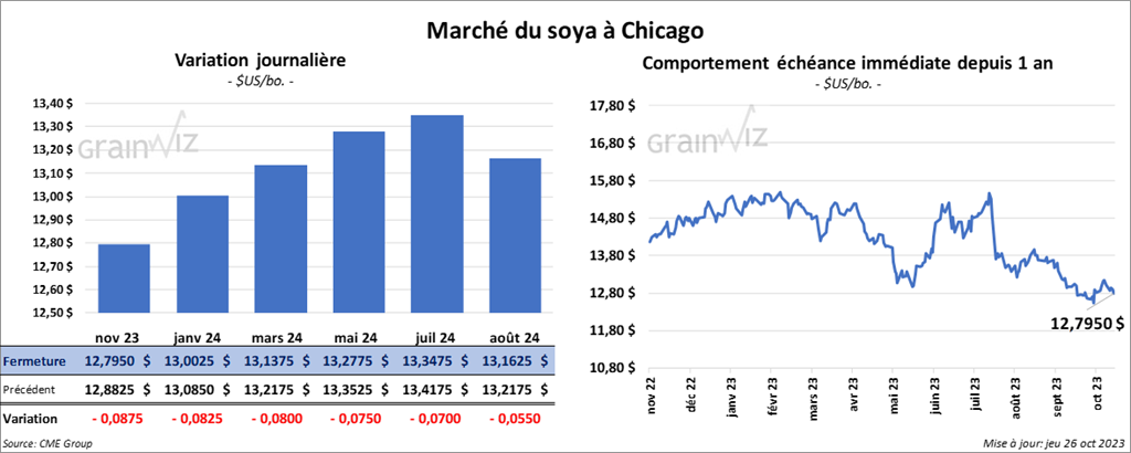 Le contrat de soya US nov. 23 a clôturé à 12,7950 $ (- 8 ¾ cents). Celui janv. 24 a fermé à 13,0025 $ (- 8 ¼ cents). Celui mars 24 a terminé à 13,1375 $ (- 8 cents). Quant au tourteau de soya US, le contrat déc. 23 a fini à 429,50 $/tonne (+ 30 cents/tonne). Celui janv. 24 a clôturé à 415,90 $/tonne (- 1,40 $/tonne). Celui mars 24 a fermé à 404,40 $/tonne (- 1,90 $/tonne). Du côté de l’huile de soya US, le contrat déc. 23 a terminé à 51,74 $ (- 86 points). Celui janv. 24 a fini à 51,10 $ (- 65 points).