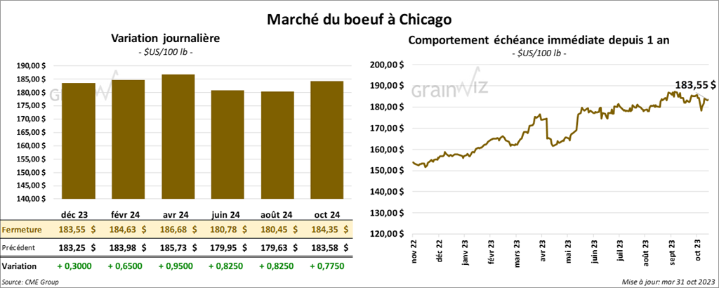 Le contrat de bœuf US déc. 23 a clôturé à 183,55 $ (+ 30 cents). Celui févr. 24 a fermé à 184,63 $ (+ 65 cents). Celui avr. 24 a terminé à 186,68 $ (+ 95 cents). Dans le cas du veau US, le contrat nov. 23 a fini à 237,70 $ (+ 3 cents). Celui janv. 24 a clôturé à 237,20 $ (+ 33 cents). Celui mars 24 a fermé à 239,75 $ (+ 38 cents).
