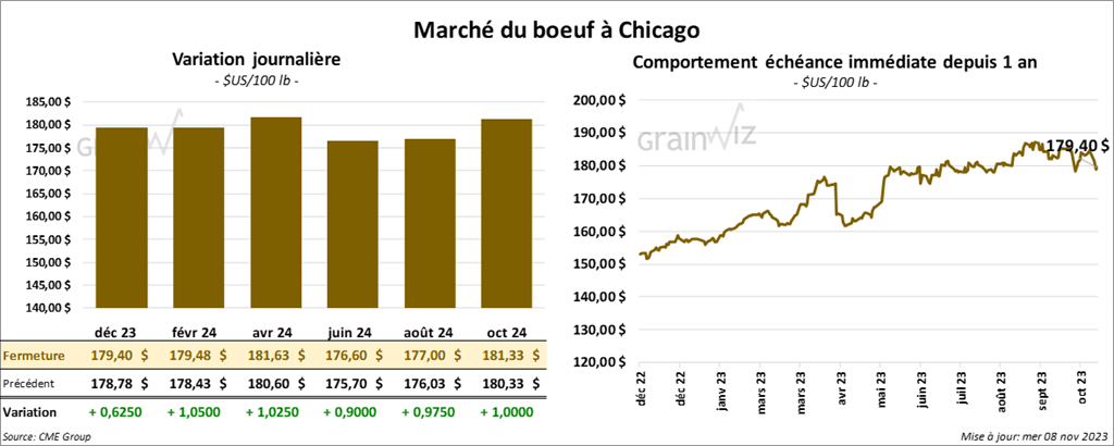 Le contrat de bœuf US déc. 23 a clôturé à 179,40 $ (+ 63 cents). Celui févr. 24 a fermé à 179,48 $ (+ 1,05 $). Celui avr. 24 a terminé à 181,63 $ (+ 1,03 $). Quant au veau US, le contrat nov. 23 a fini à 234,55 $ (+ 2,33 $). Celui janv. 24 a clôturé à 232,78 $ (+ 1,95 $). Celui mars 24 a fermé à 235,00 $ (+ 1,75 $).