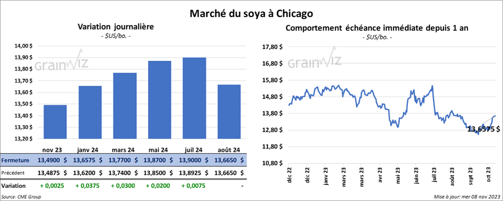 Le contrat de soya US nov. 23 a clôturé à 13,4900 $ (+ ¼ cent). Celui janv. 24 a fermé à 13,6575 $ (+ 3 ¾ cents). Celui mars 24 a terminé à 13,7700 $ (+ 3 cents). Quant au tourteau de soya US, le contrat déc. 23 a fini à 449,80 $/tonne (+ 2,40 $/tonne). Celui janv. 24 a clôturé à 439,00 $/tonne (+ 20 cents/tonne). Celui mars 24 a fermé à 430,30 $/tonne (- 80 cents/tonne). Du côté de l’huile de soya US, le contrat déc. 23 a terminé à 49,95 $ (+ 46 points). Celui janv. 24 a fini à 49,34 $ (+ 21 points).
