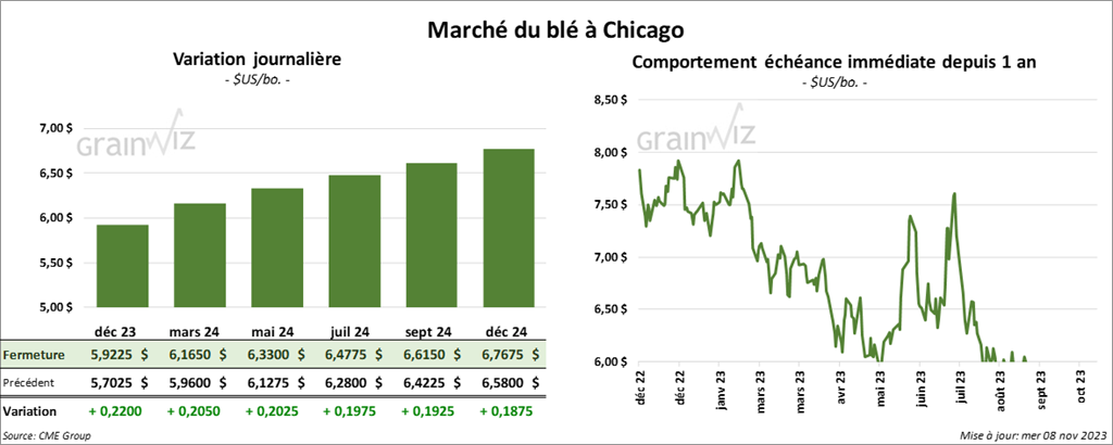 À Chicago, le contrat de blé déc. 23 a clôturé à 5,9225 $ (+ 22 cents). Celui mars 24 fermé à 6,1650 $ (+ 20 ½ cents). Celui mai 24 a terminé à 6,3300 $ (+ 20 ½ cents). À Kansas, le contrat de blé dur rouge déc. 23 a fini à 6,5500 $ (+ 22 ½ cents). Celui mars 24 a clôturé 6,6440 $ (+ 21 cents). Celui mai 24 a fermé à 6,7120 $ (+ 19 ¾ cents). À Minneapolis, le contrat déc. 23 a terminé à 7,3550 $ (+ 11 ¼ cents). Celui mars 24 a fini à 7,5000 $ (+ 9 ½ cents). Celui mai 24 a clôturé à 7,6050 $ (+ 9 ¾ cents).