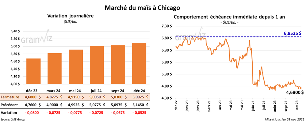 Le contrat de maïs US déc. 23 a clôturé à 4,6800 $ (- 8 cents). Celui mars 24 a fermé à 4,8275 $ (- 7 ¼ cents). Celui mai 24 a terminé à 4,9150 $ (- 7 ¾ cents).