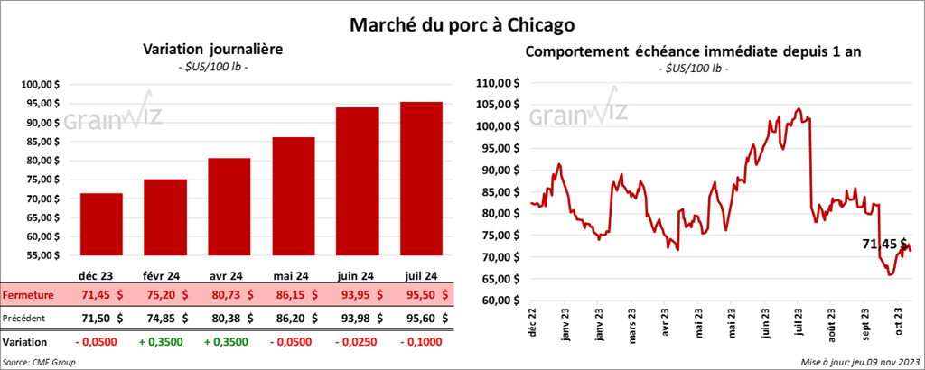Le contrat de porc US déc. 23 a clôturé à 71,45 $ (- 5 cents). Celui févr. 24 a fermé à 75,20 $ (+ 35 cents). Celui avr. 24 a terminé à 80,73 $ (+ 35 cents).
