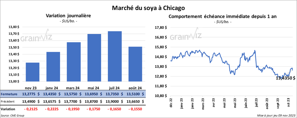 Le contrat de soya US nov. 23 a clôturé à 13,2775 $ (- 21 ¼ cents). Celui janv. 24 a fermé à 13,4350 $ (- 22 ¼ cents). Celui mars 24 a terminé à 13,5750 $ (- 19 ½ cents). Quant au tourteau de soya US, le contrat déc. 23 a fini à 449,90 $/tonne (+ 10 cents/tonne). Celui janv. 24 a clôturé à 436,20 $/tonne (- 2,80 $/tonne). Celui mars 24 a fermé 425,70 $/tonne (- 4,60 $/tonne). Du côté de l’huile de soya US, le contrat déc. 23 a terminé à 50,45 $ (+ 50 points). Celui janv. 24 a fini à 49,77 $ (+ 43 points).